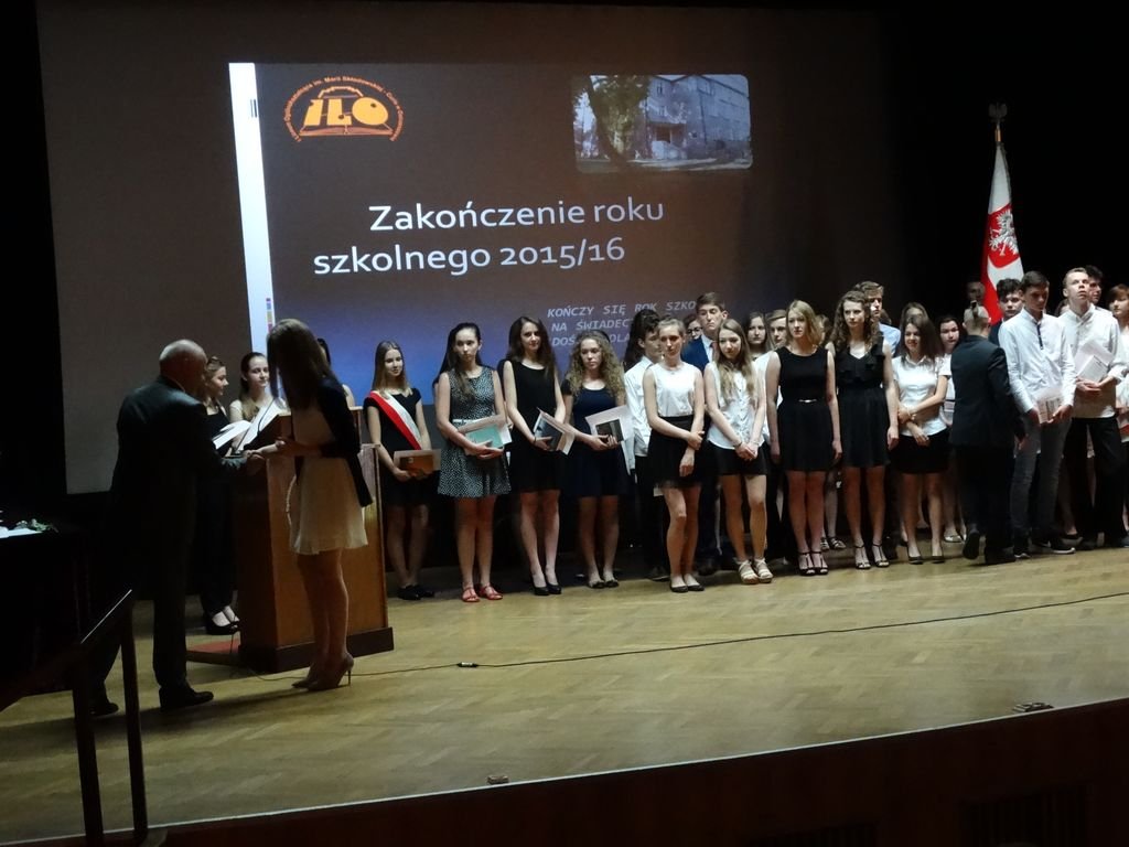 Pan Dyrektor Ryszard Kalina osobiście wręczył nagrody i pogratulował wyróżnionym , wśród nich znaleźli się uczniowie z najwyższymi średnimi oraz z najlepszą frekwencją. Wywołani przez konferansjerów (w tej roli Adrianna Plichta i Konrad Wieczorek) na scenę nagrodzeni upewnili się w przekonaniu, że wysiłek i rzetelna praca przynoszą spełnienie i poczucie satysfakcji.